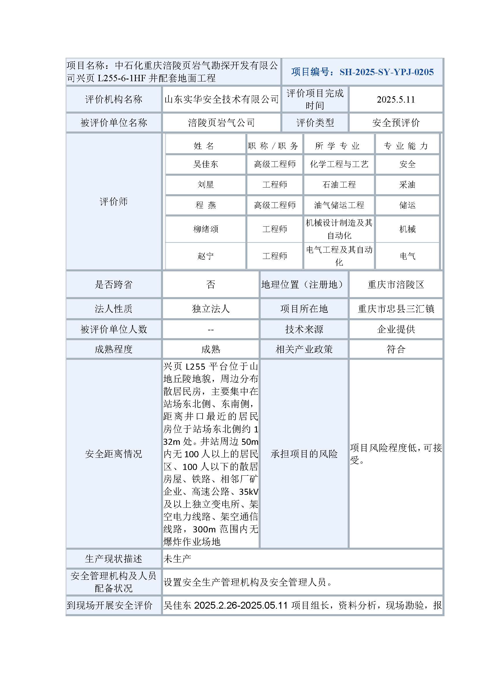 中石化重慶涪陵頁巖氣勘探開發(fā)有限公司興頁L255-6-1HF井配套地面工程安全預評價