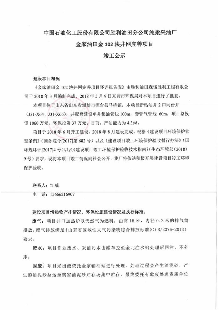 中國石油化工股份有限公司勝利油田分公司純梁采油廠金家油田金102塊井網完善項目竣工公示